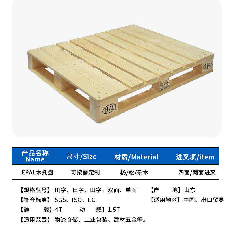 1.歐洲標(biāo)準(zhǔn)托盤(Pallet EUR1,尺寸標(biāo)準(zhǔn):1200mm×800mm×144mm)為常用型號(hào),主要使用國為歐洲大陸、德、法等。設(shè)計(jì)大靜載6000KG,大動(dòng)載2000KG,為四面進(jìn)叉。